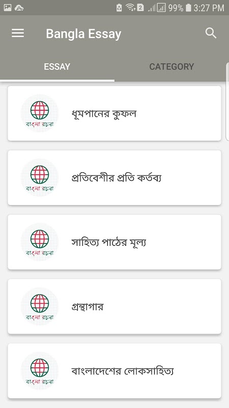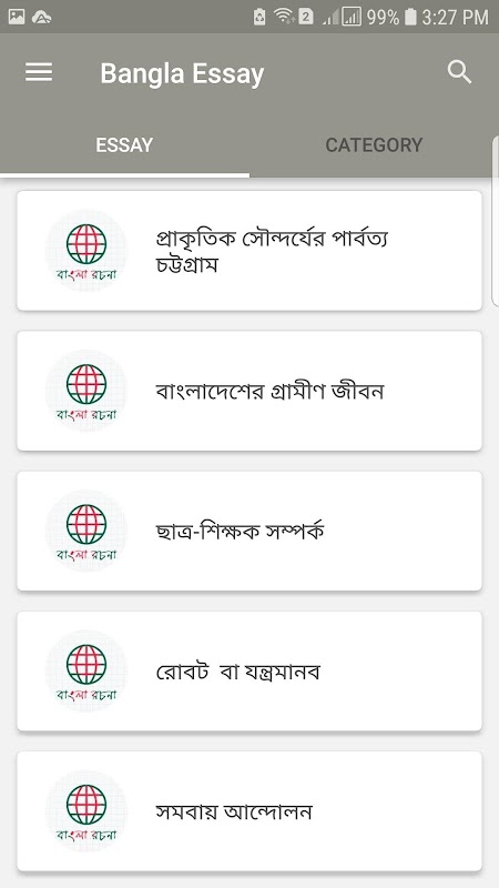 Chào mừng bạn đến với Ứng dụng cuối cùng. Đây là ứng dụng ngày hôm nay của chúng tôi được thực hiện với Bộ sưu tập tiểu luận Bangla. Ứng dụng này có chứa bộ sưu tập hơn 200 bài luận tiếng Bengali. Những bài luận đó nằm trong ứng dụng này-