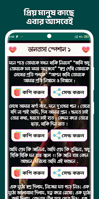 Bạn sẽ nhận được tin nhắn bangla và tin nhắn tình yêu với tất cả các loại tin nhắn trong tất cả ứng dụng tin nhắn.