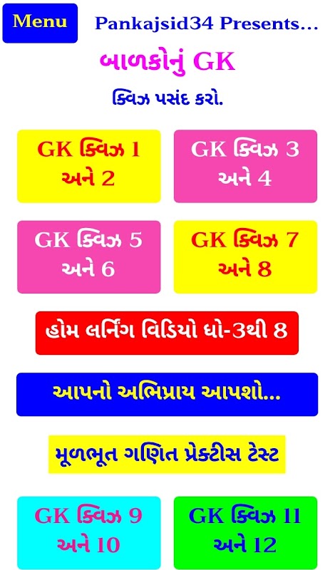 Pankajsid34 giới thiệu Ứng dụng Trắc nghiệm Kiến thức Tổng quát Gujarati Trực tuyến cho Tiêu chuẩn 3 đến 6. Các tính năng sao của ứng dụng được đưa ra bên dưới.