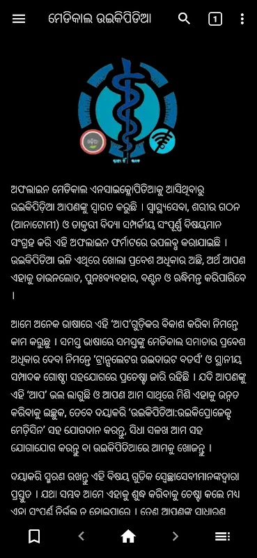 ବର୍ଣ୍ଣନା: ଉଇକିପିଡିଆର ଅଫଲାଇନ ମେଡିକାଲ ଏନସାଇକ୍ଳୋପେଡିଆରେ ସ୍ୱାସ୍ଥ୍ୟସେବା ସମ୍ବନ୍ଧୀୟ ବିଷୟମାନଙ୍କର ବିରାଟ ସଂଗ୍ରହ ଆଣ୍ଡ୍ରଏଡରେ ଉପଲବ୍ଧ. ଏଥିରେ ମେଡିକାଲ, ଶରୀର ଗଠନ (ଆନାଟୋମୀ), ଔଷଧ ଓ ପରିଚ୍ଛନ୍ନତା ସମ୍ପର୍କରେ ଲେଖାମାନ ଅଛି. ଇଣ୍ଟରନେଟ ଉପଲବ୍ଧ ନ ଥିବା ସ୍ଥାନରେ, ଜନମାନବଶୂନ୍ୟ ସ୍ଥାନରେ ବା ଡଙ୍ଗାରେ ଥିଲେ ମଧ୍ୟ ଆପଣ ସର୍ବାଧିକ ମହତ୍ତ୍ଵପୂର୍ଣ୍ଣ ଓ ସର୍ବାଧୁନିକ ଭେଷଜ ଶବ୍ଦକୋଷ ବା ମେଡିକାଲ ଅଭିଧାନ / ଡିକସନାରିରେ ବିନାମୂଲ୍ୟରେ ପ୍ରବେଶ ଅଧିକାର ପାଇପାରିବେ. ଗୋଷ୍ଠୀ ସ୍ୱାସ୍ଥ୍ୟକର୍ମୀ, ଡାକ୍ତର, ଡାକ୍ତରୀ ଛାତ୍ର ଓ ସ୍ୱାସ୍ଥ୍ୟ ସମ୍ବନ୍ଧରେ ରୁଚି ରଖୁଥିବା ଲୋକଙ୍କ ନିମନ୍ତେ ଏହା ଅମୂଲ୍ୟ. ଏହା ଅନ୍ୟାନ୍ୟ ଅନେକ ଭାଷାରେ ମଧ୍ୟ ତିଆରି ହୋଇଛି ତଥା ଚୟନ କରିଥିବା ଓ ବିଷୟଗୁଡ଼ିକର ସଂଖ୍ୟା ଓ ମାନକୁ ଉନ୍ନତ କରିବାକୁ ସର୍ବଦା ଚେଷ୍ଟା ଚାଲିଛି.