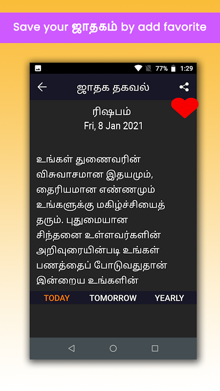 So all the Tamil people, நீங்கள் தயாரா? For routing your horoscope every morning! தமிழ் ஜாதகம்: Tamil Jathagam 2019 is a unique app specially designed for Android users to facilitate them by providing them with their horoscope in their mother tongue Tamil! தமிழ் ஜாதகம்: Tamil Jathagam 2019 app is a feature-driven app that provides horoscope for each zodiac sign just by a click. உங்கள் இராசி அடையாளம் விளக்கத்தை உடனடியாக அறிந்து கொள்ளுங்கள் by installing தமிழ் ஜாதகம்: Tamil Jathagam 2019 app. தமிழ் ஜாதகம்: Tamil Jathagam 2019 app is easy to install and operate. தமிழ் ஜாதகம்: Tamil Jathagam 2019 app has a simple and user-friendly GUI.