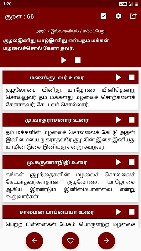 • Người dùng có thể chọn giải thích ưa thích của họ để xem và chia sẻ Kural.