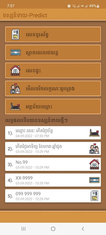 តាមរយៈកម្មវិធីនេះ លោកអ្នកអាចធ្វើការមើលហុងស៑ុយ លេខទូរស័ព្ទ, ផ្លាកលេខរថយន្ត, ឈ្មោះ, ថ្ងៃកំណើត, គូស្រករ ឬ ការទស្សន៍ទាយផ្សេងៗ