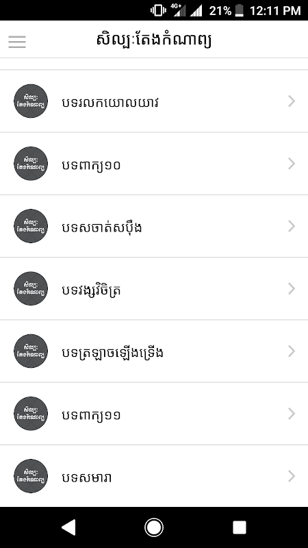 សិល្បះតែងកំណាព្យត្រូវបានដកស្រង់ចេញពីសៀវភៅរបស់លោក ពេជ្រ ទុំក្រវិល។ ឥឡូវសៀវភៅនេះត្រូវាបានខ្ញុំបានរៀបចំបង្កើតជាកម្មវិធីសម្រាប់ Smart Phone Android ដើម្បីងាយស្រួលប្រើប្រាស់។