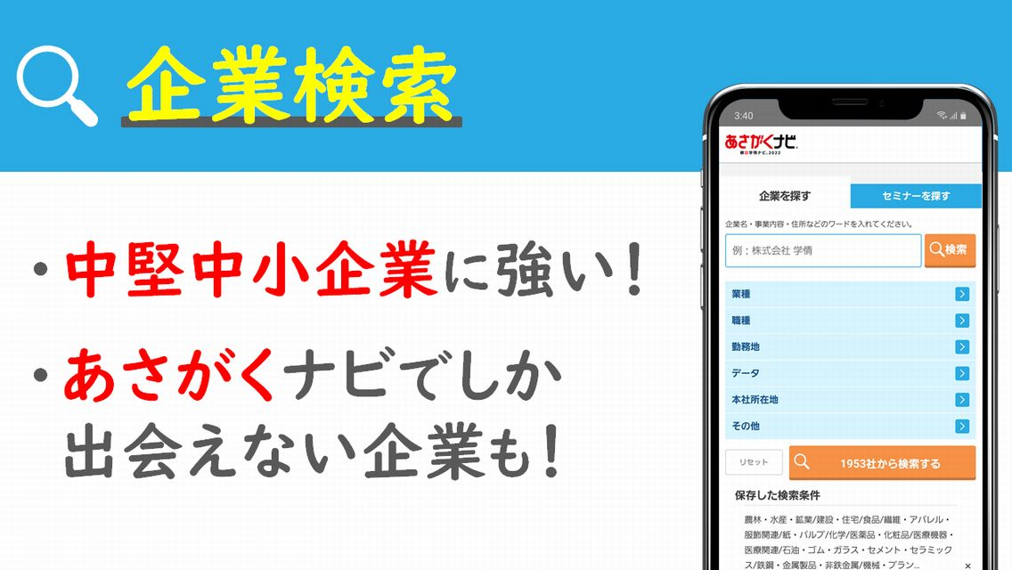 新卒向け就活・就職情報サイト「あさがくナビ2022」の公式アプリです。