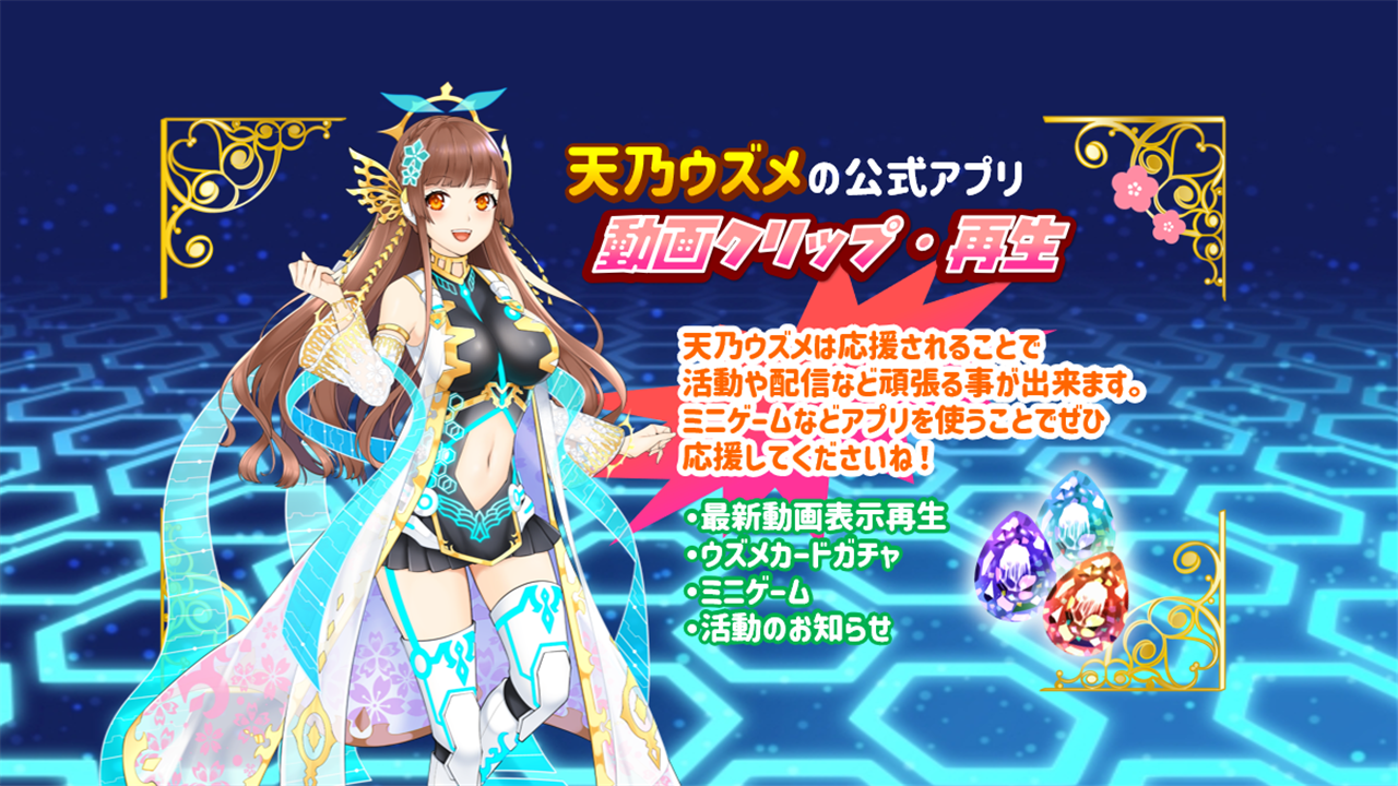 Đây là ứng dụng chính thức của YouTuber ảo "Uzume Amano". Nó được trang bị nhiều tính năng như giọng nói của Uzume nơi bạn có thể nghe và gacha nơi bạn có thể thu thập thẻ!