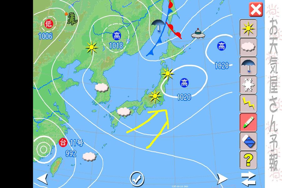 画面下のチェックボタンを押すと正しい天気が天気記号で表示されます。