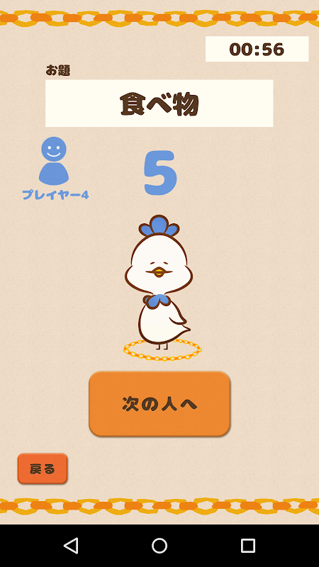 「お題に添わなければいけない」「頭文字をつなげなければいけない」という2つの条件を満たしながら、決められた制限時間内にテンポ良く答えていきます。(これが地味に難しい!)