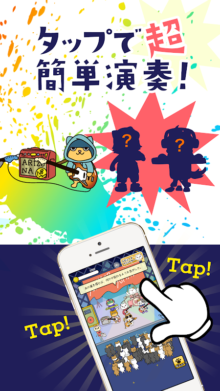 ギター、ドラム、ベース、ラッパー!いろんなねこをあつめてバンドを結成しよう! 笑えるバンドあるあるがいっぱい♪普段ゲームをしない人でも遊べる、お手軽アプリです♪