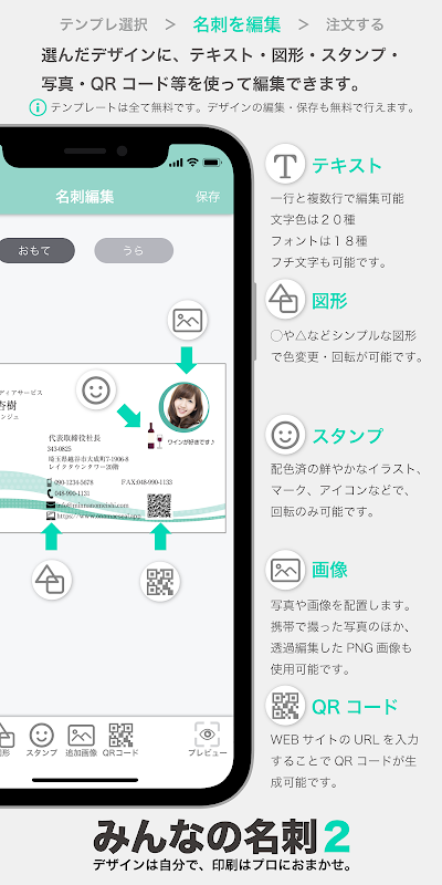 名刺作成アプリのパイオニア「みんなの名刺」の最新版アプリです。豊富なデザインから選んでオリジナルの名刺を作成・注文出来ます。1セット40枚入りで990円。
