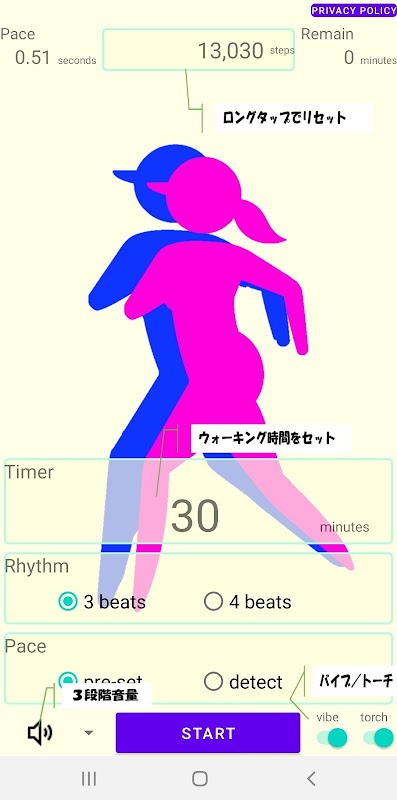 音や振動、カメラトーチでウォーキングのステップリズムをお知らせするシンプルなユーティリティアプリです。