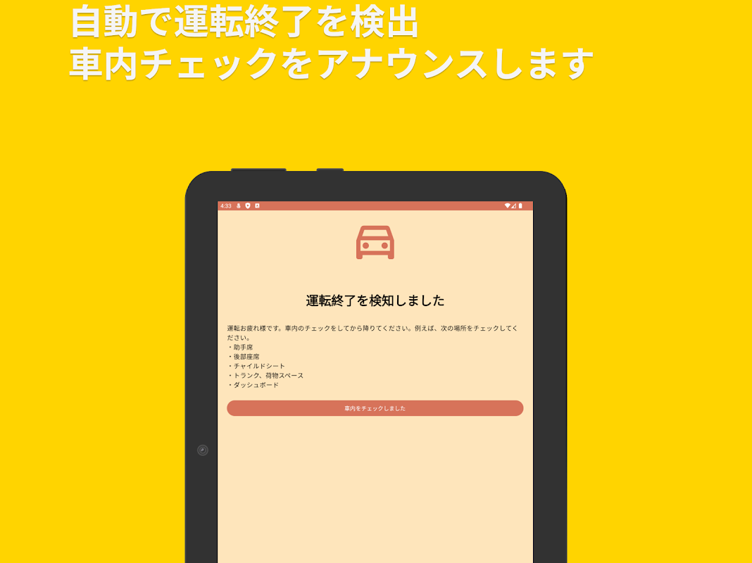 Nếu bạn cài đặt Kizuna Watch và cho phép nhiều quyền khác nhau, nó sẽ tự động phát hiện việc kết thúc quá trình lái xe và nhắc bạn kiểm tra độ an toàn bên trong xe. Có những điều bạn có thể làm để bảo vệ mình bằng cách kiểm tra bên trong xe ít nhất một lần trước khi xuống xe.
