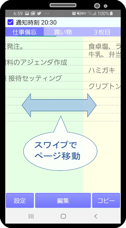 5ページだけのシンプルなメモ帳です。通知設定すれば、毎日 決まった時間に確認できるから安心です。備忘メモ、買い物メモなど、使い方いろいろ !(^^)!