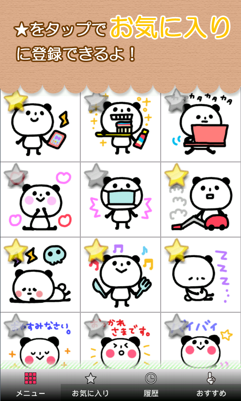 LINEなどでスタンプみたいに使える無料の画像集アプリです画像を選択して送りたいアプリを選択するだけの簡単操作ですお気に入りや履歴機能があって超便利!