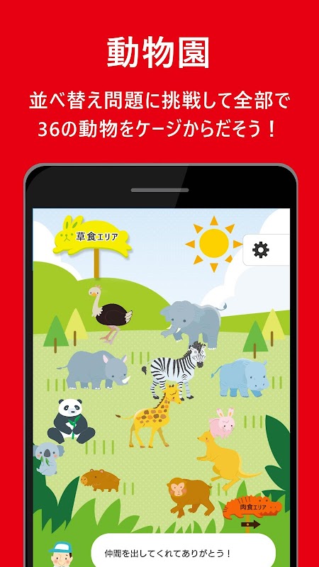 Trong vườn bách thú, các động vật ra khỏi chuồng sẽ di chuyển khi câu trả lời đúng được đưa ra trong bài toán sắp xếp. Các khu vực khác nhau được đặt cho từng tốc độ và có các động vật khác nhau ở mỗi khu vực. Hãy làm hết sức mình để bạn có thể có được tất cả 36 loại động vật.