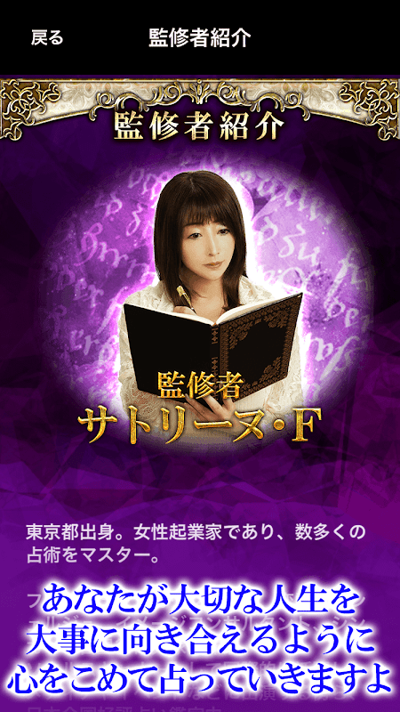 本アプリは、世界中から依頼が殺到するソウルスキャナー「サトリーヌ.F」の鑑定をあなたのお手元でご体験できるアプリです。魂を解読し、そのすべてを視抜いていきます。
