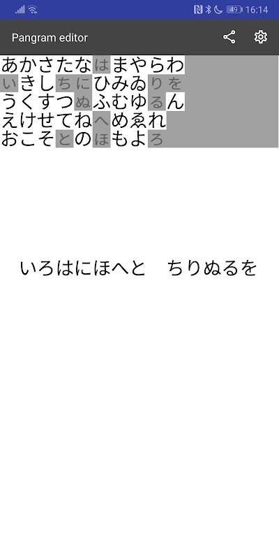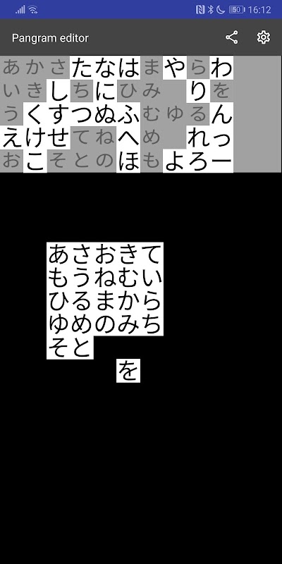 ひらがなを並べ替え、いろは歌のような文章(パングラム)を作成するのに役立つアプリ。ひらがなを指で並べ替えたり、「共有」メニューから他アプリと共有できます。