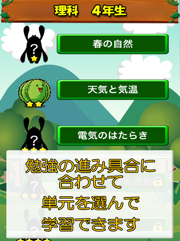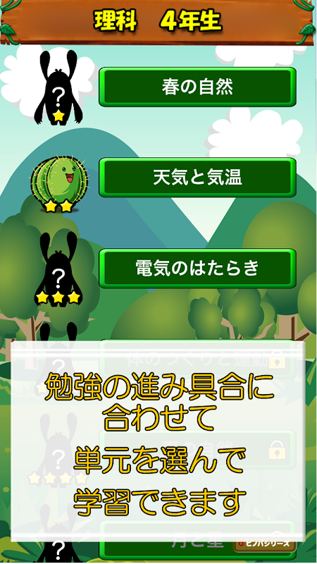 小学校4年生の理科アプリの決定版!学習の進み具合に合わせて単元を選択して、効率的に復習できます。4択のクイズ形式という使いやすさ、勉強のご褒美にモンスターを集めていく楽しさで、子供が継続的に勉強します。