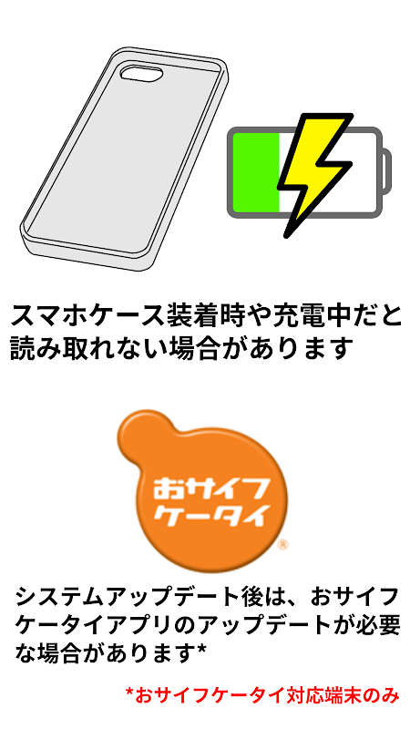 ・Androidを4.4→5.0にアップグレードしてから読み取れなった場合は、「おサイフケータイ」アプリを起動してみてください。アップデートの案内が出た場合は、案内に従ってアップデートすることで読み取れるようになる場合があります。