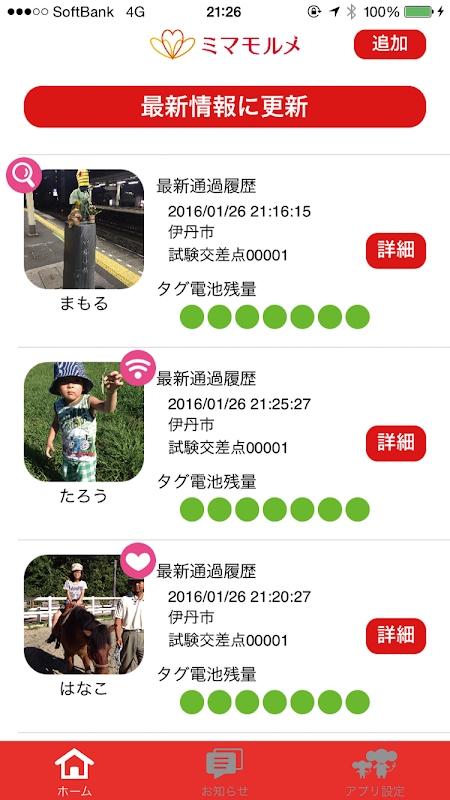 校門付近などに設置された受信器が、ご家族がお持ちのタグを検知してこのアプリに位置情報を通知します。