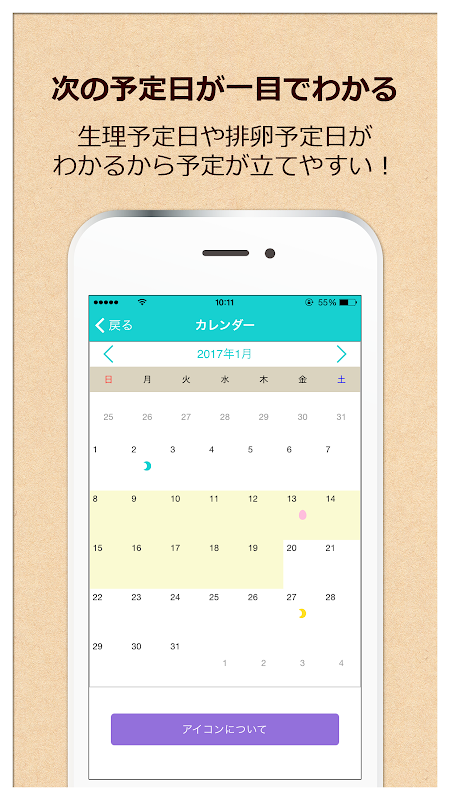 生理日を簡単に入力するだけで、次の生理予定日、排卵予定日、周期変動がすぐ分かります。
