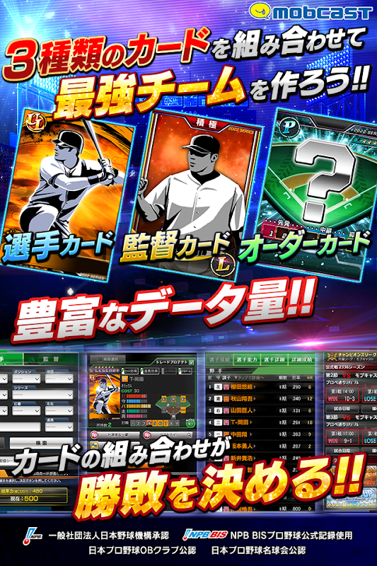 Ngoài các cầu thủ đang hoạt động của tất cả 12 đội bóng chày chuyên nghiệp, những cầu thủ nổi tiếng trong quá khứ đã tô màu cho lịch sử bóng chày và cầu thủ trợ giúp đáng nhớ đó cũng xuất hiện. Giấc mơ chín kết hợp nghĩa vụ tích cực và cựu sinh viên cũng có thể thành hiện thực! Tạo một đội trong mơ với trò chơi đánh bài bóng chày chuyên nghiệp quy mô đầy đủ "Mobapro" mà không cần đăng ký, và hãy hiện thực hóa cuộc đối đầu trong mơ của bạn bằng chính bàn tay của bạn!