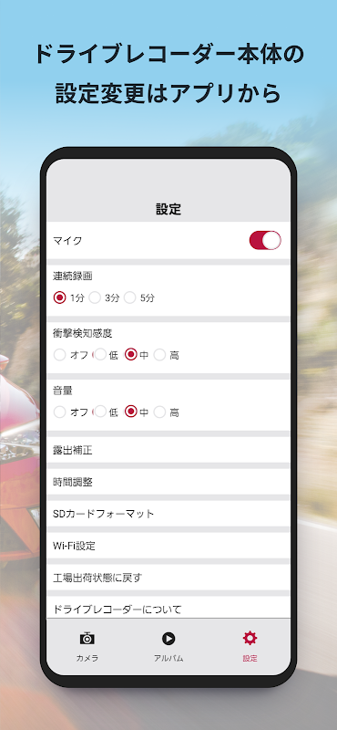 ・Thay đổi cài đặt (thời gian ghi liên tục, cài đặt độ nhạy phát hiện sốc, v.v.)