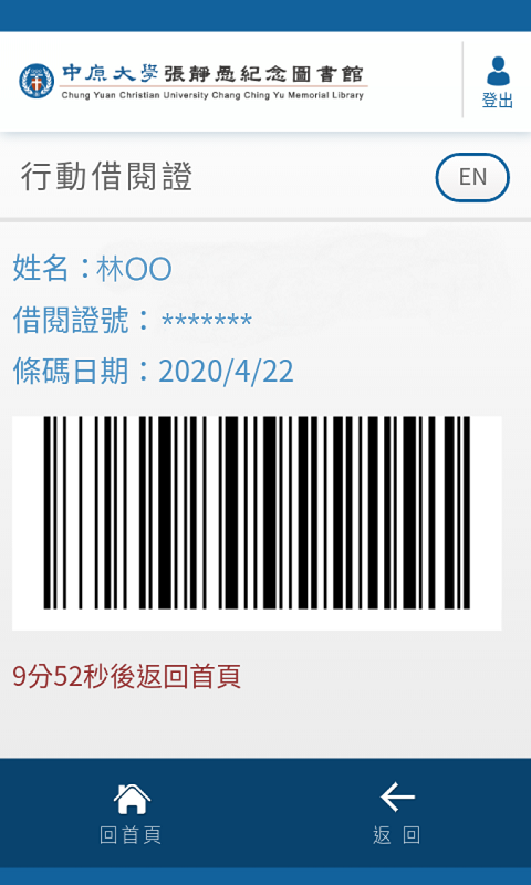 4. 行動借閱證:在登入狀態下點擊,再次驗證密碼後,即可成功產生行動借閱證,提供臨櫃借書服務。