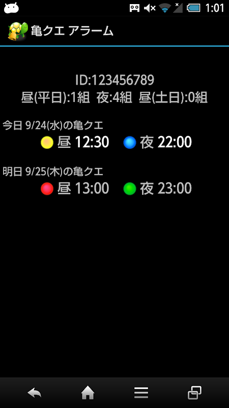 ユーザIDの下2桁または全桁を入力することで、亀クエの時間をアラーム(画面)やステータスバー通知でお知らせしてくれます。