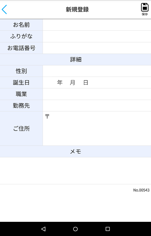お客様情報の登録では、生年月日や郵便番号などは選択記入方式になっており、ふりがなも自動入力となっていますので、直接お客様にタブレットで入力していただくことも可能です。