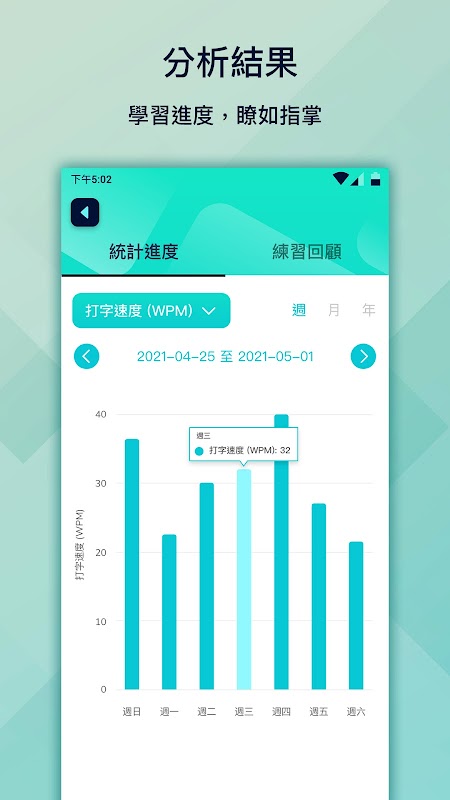• Chương trình sẽ tự động ghi lại tốc độ nhập liệu của người dùng, thời gian đúng và sai trong mỗi lần thực hành và trình bày các bản ghi cho người dùng thông qua biểu đồ để bạn có thể hiểu rõ hơn về tiến trình học tập của mình.