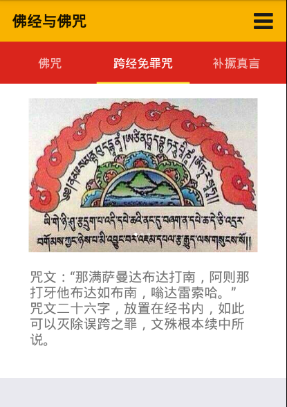 Không có quảng cáo, âm thanh hỗ trợ bộ nhớ đệm ngoại tuyến. Rất nhiều kinh Phật và thần chú đã được thu thập, và có phần giới thiệu tương ứng và âm nhạc, tụng kinh, bính âm, tiếng Phạn và các ký hiệu ngữ âm khác. Có thể chơi mà không cần kết nối internet sau khi tải xuống