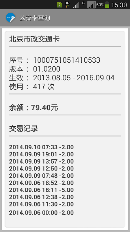 快速查看公交卡余额及交易记录,支持的以下城市的公交卡:北京,深圳,武汉,香港,青岛,西安(理论支持所有城市的公交卡)。
