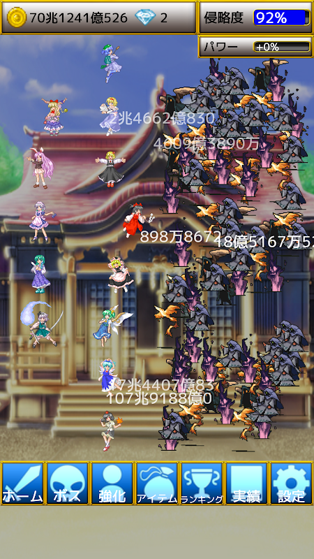 博麗神社を守れ! は、東方キャラを育ててボスを倒して博麗神社を守る放置ゲームです。侵略度が上がると不利になってしまうぞ!実績、ランキングにも対応!