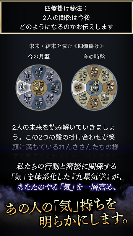 Ngoài ra, trong số rất nhiều bói toán, "Kyusei Kigaku" có đặc điểm là có thể "thay đổi" cũng như "biết" câu trả lời. Bạn không chỉ biết vận may của mình và tình cảm của người ấy mà còn dẫn bạn đến tương lai mà bạn mong muốn. Hãy thực hiện bước đầu tiên để chúc may mắn với "Kyusei Kigaku".
