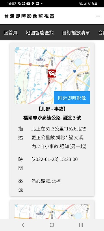 Màn hình video thời gian thực trên khắp Đài Loan, chẳng hạn như đường quốc lộ, đường cao tốc, đường đô thị và các điểm du lịch nổi tiếng, cung cấp tài liệu tham khảo lập kế hoạch du lịch miễn phí cho mọi người.