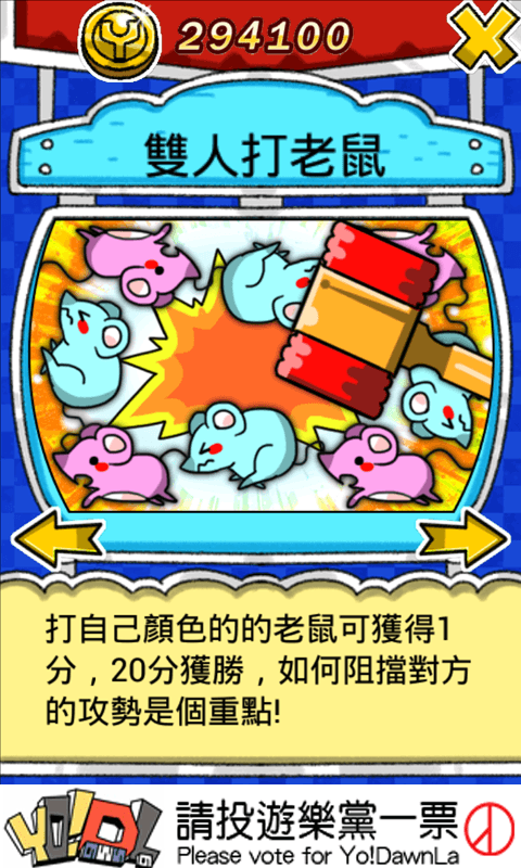 雙人打老鼠(打自己顏色的的老鼠可獲得1分,20分獲勝,如何阻擋對方的攻勢是個重點!