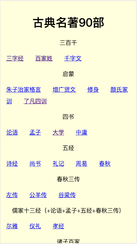 本应用收集整理了约90部中国古典文学名著,包括四书五经和诸子百家等,并做了简单的分类。目录如下: