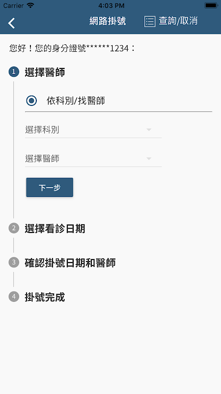 2. 查詢/取消: 可用身分證字號或病歷號碼及出生日期,查詢取消門診掛號。