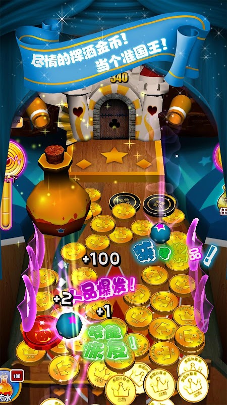 通過向城堡遊戲機中投入源源不斷的金蔽,升級城堡的各項技能,妳就能將成堆的快樂和驚喜推出來。遊戲的樂趣遠不止如此---在莊嚴華麗的城堡冒險並不斷的解瑣古堡秘密,將會獲得無尚的獎勵!閑暇之余還有開心轉盤增添刺激,使用壹張獎券以小搏大在此壹舉!讓我們壹起來撤底釋放緊繃的神經,當壹回國王,盡情享受金蔽滾滾的樂趣吧!
