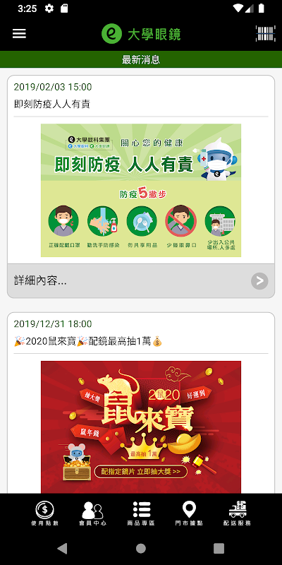 大學眼鏡貼心的提供大學會員專屬的 APP 服務,除了介紹門市、最新訊息、優惠活動、並提供商品配送服務,再結合多項點數機制,提供會員更超值的享受與服務。