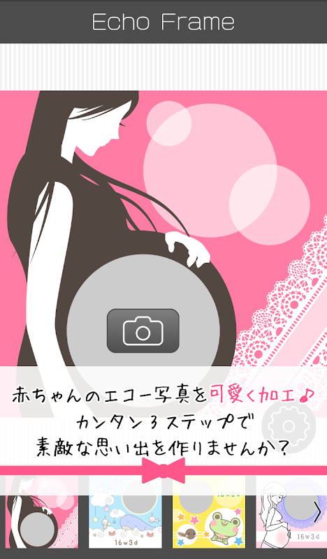 かわいいフレームでエコー画像を妊娠中の思い出の一枚に♪「エコーフレーム」はエコー画像をいつまでもかわいく残しておきたいママのために作られたアプリです。