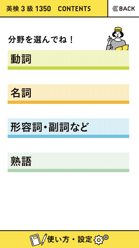 Tạo quiz bằng cách trích từ series "Eiken Rank Order" phân tích kỹ lưỡng dữ liệu câu hỏi trong quá khứ của Eiken. Cũng giống như sách, nó được chia theo cấp độ và chủ đề nên bạn có thể học theo trình độ của mình.