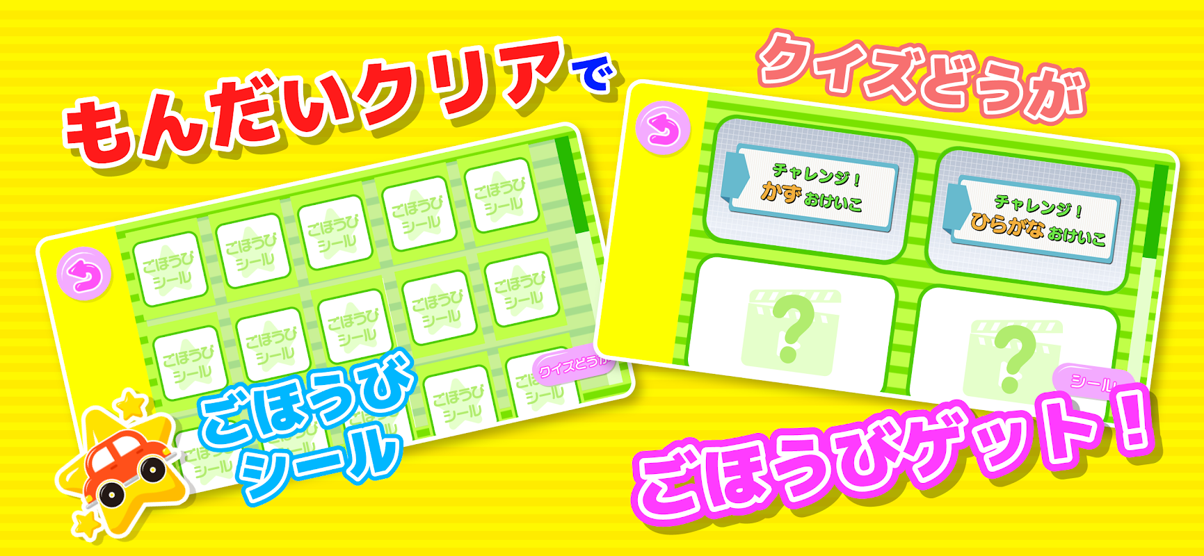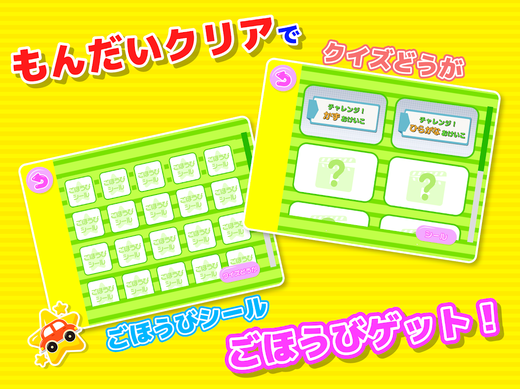 Bạn có thể vui vẻ học Hiragana, Kazu, tiếng Anh, cách đọc đồng hồ, v.v. cùng với hình ảnh của nhiều loại xe khác nhau. Có rất nhiều vấn đề mà bạn có thể học khi chơi, chẳng hạn như trò chơi mê cung và nhãn dán.
