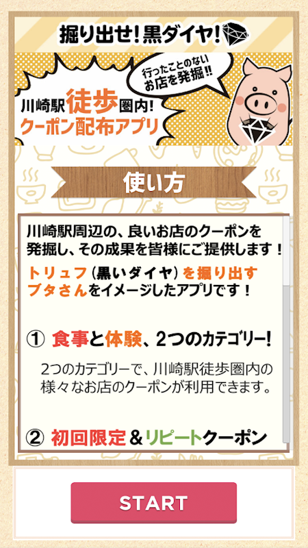 オリジナルクーポン多数!川崎駅周辺の良いお店のクーポンを発掘し、皆様にご提供します!トリュフ(黒いダイヤ)を掘り出すブタさんをイメージしたアプリです!