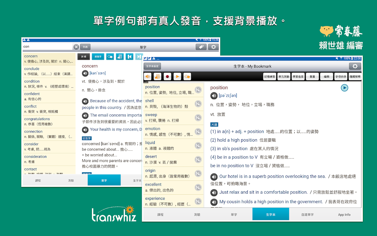 Nội dung của chuỗi khóa học ứng dụng này được biên tập lại dựa trên "Từ điển tham khảo tiếng Anh cấp ba" do Trung tâm thi tuyển sinh đại học phát hành vào tháng 7 năm 2019. Các từ gốc được xem xét theo nền tảng văn hóa, ngôn ngữ hàng ngày và trình độ học vấn của người dùng. -từ tần suất ở cấp độ giảng dạy và từ tần suất bị loại bỏ. Từ vựng thông tục, cấp thấp, một số từ viết tắt và danh từ riêng, v.v., các từ được sắp xếp theo tần suất sử dụng và các từ quan trọng cần thiết cho học tập và các kỳ thi khác nhau được thêm vào. Ngoài việc tự học, nó còn phù hợp cho các bài kiểm tra học thuật, bài kiểm tra nghe tiếng Anh cấp ba và các kỳ thi quốc gia. Các kỳ thi như thanh tra cấp tiểu học của Anh, hệ thống phổ biến TOEIC mới.. . và như thế. Phần giải thích từ đi kèm rất chi tiết và có nội dung phong phú, bao gồm các cụm từ, từ phái sinh, từ đồng âm/trái nghĩa, từ dễ nhầm lẫn và cách sử dụng cụm từ, v.v. Các từ và câu ví dụ cũng có cách phát âm chuẩn của người Mỹ.