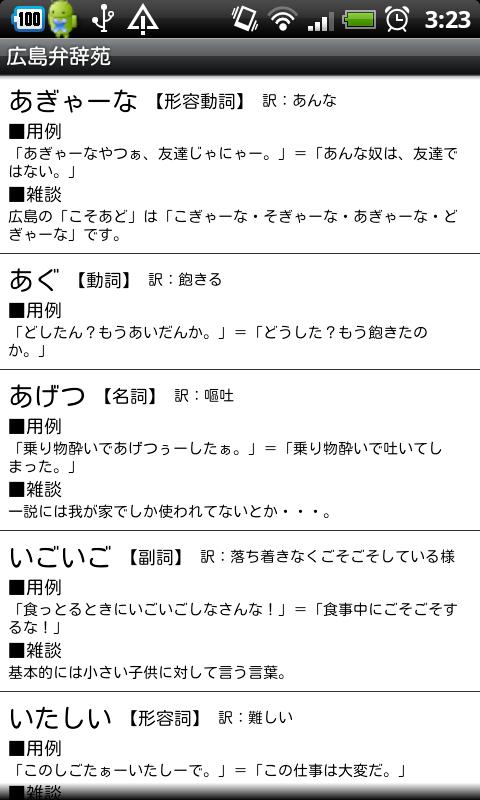 このアプリは広島弁の辞典です。ただの辞書的な情報の他に、私からのちょっとした付加情報、というか雑談も記載してますので、結構おもしろいかと思います。