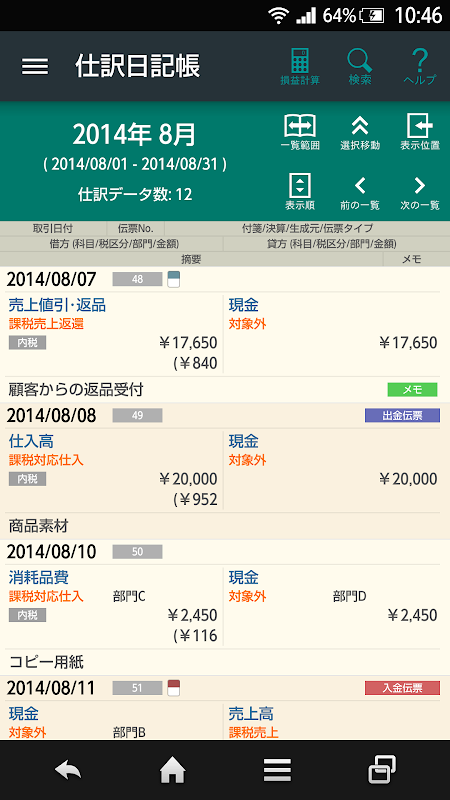 ・「総勘定元帳」の「集計」で、相手科目の一覧をタップすると該当する仕訳データを検索する機能を追加しました。