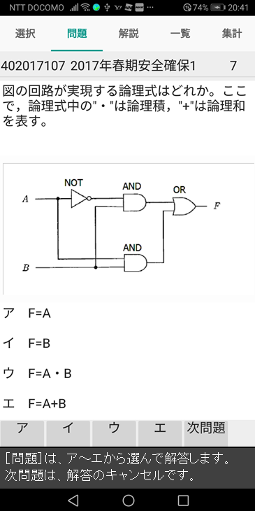 [問題]で、選択肢から、解答を選びます。解答を選ぶと[解説]画面に変わります。