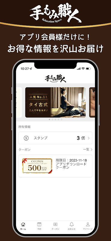 Thông qua ứng dụng, bạn có thể nhận được thông tin và ưu đãi mới nhất về máy mát xa tay. Bạn cũng có thể kiểm tra menu, khung thời gian mong muốn và đặt chỗ từ điện thoại thông minh của mình bất kỳ lúc nào. Bằng cách cài đặt ứng dụng, bạn có thể sử dụng nghệ nhân massage tay thuận tiện và chặt chẽ hơn.